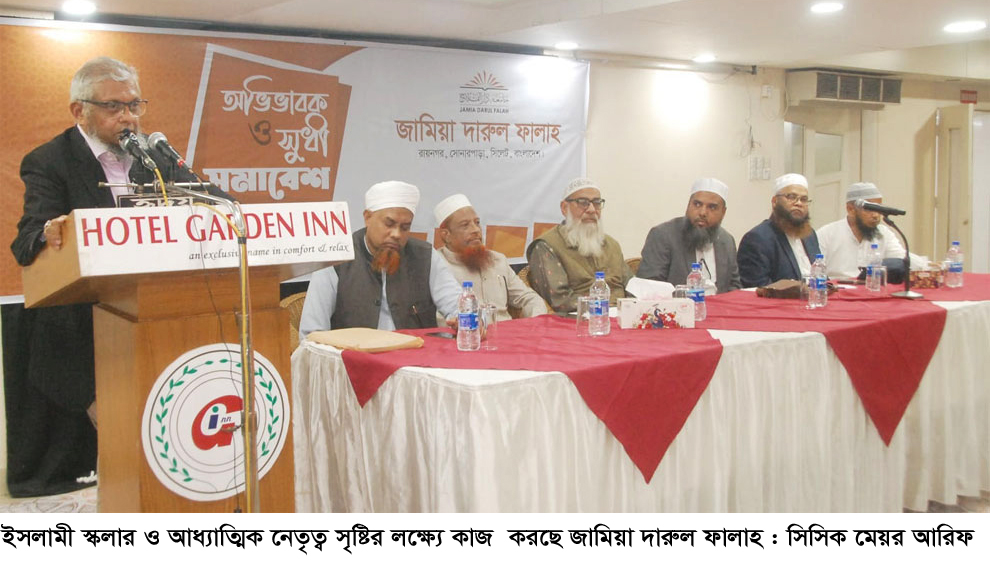 সিলেট এইজ: মেধার যাথাযথ বিকাশ, প্রযুক্তিগত দক্ষতা,দেশ-বিদেশে গ্রহণযোগ্য ইসলামীক স্কলার ও আধ্যাত্মিক নেতৃত্ব সৃষ্টির লক্ষ্যে প্রচেষ্টা চালিয়ে যাচ্ছে জামিয়া দারুল ফালাহ। আশাকরি যোগ্য ও আদর্শ জাতি গঠনে অগ্রণী ভূমিকা পালন করবে জামিয়া দারুল ফালাহ। গত শুক্রবার (২৩ ডিসেম্বর) হোটেল গার্ডেন ইনে জামিয়া দারুল ফালাহ আয়োজিত অভিভাবক ও সুধী সমাবেশে প্রধান অতিথির বক্তব্যে সিসিক মেয়র আরিফুল হক চৌধুরী উপরিউক্ত কথাগুলো বলেন। জামিয়ার পরিচালনা পর্ষদ সভাপতি অধ্যাপক বজলুর রহমানের সভাপতিত্বে অনুষ্ঠিত সমাবেশে জামিয়ার বিগত বছরের রিপোর্ট ও আগামীর পরিকল্পনা পেশ করেন জামিয়ার প্রতিষ্ঠাতা প্রিন্সিপাল হাফিজ মাওলানা শিব্বির আহমদ। বিশেষ অতিথির বক্তব্য রাখেন, নগরীর নাইওরপুল মসজিদের ইমাম ও খতিব হাফিজ মাওলানা নজমুদ্দীন কাশেমী,ইমাম প্রশিক্ষণ একাডেমী সিলেটের সহকারী পরিচালক মাওলানা শাহ নজরুল ইসলাম,মাওলানা ছাদিকুর রাহমান,মাওলানা খলিলুর রহমান,বাংলাদেশ ব্যালকের সাবেক ডিজিএম জনাব আশরাফ হোসেন জামান,,জনাব আব্দুল কুদ্দুস হেলাল,জনাব কাওসার আহমদ টিপু,আকিকুর রাহমান,মাওলানা মনির হোসাইন, সাবেক চেয়ারম্যান এসএম আনোয়ার হোসাইন প্রমূখ জামিয়ার ৫ বছর মেয়াদী পরিকল্পনা, মসজিদ কমপ্লেক্স তৈরী, উন্মুক্ত পাঠাগার,ইমাম-মুয়াজ্জিন ট্রেনিং প্রোগ্রাম, পৃথক (ছেলে-মেয়ে) ইসলামীক স্কুল,লাইব্রেরি, এইচএসসি সমমান মাদরাসা, শিক্ষকদের জন্য ফ্যামিলি কোয়ার্টার, কম্পিউটার ল্যাব, কারিগরি প্রশিক্ষণ, সামাজিক অনুষ্ঠানের জন্য হলরুম, পৃথক (ছাত্র-ছাত্রী) খেলার মাঠ, প্রাথমিক চিকিৎসাকেন্দ্র, কবরস্থান প্রভৃতি।